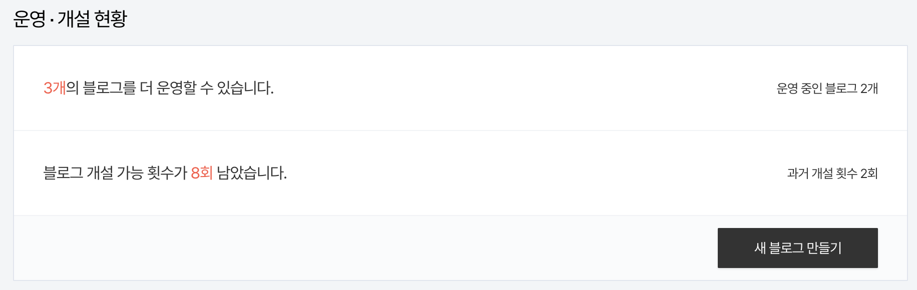 - 이건 너무 쉬우니 넘어가도록 하자. 참고로 블로그는 10개 생성 가능하고 동시에 5개 운영이 가능하다.