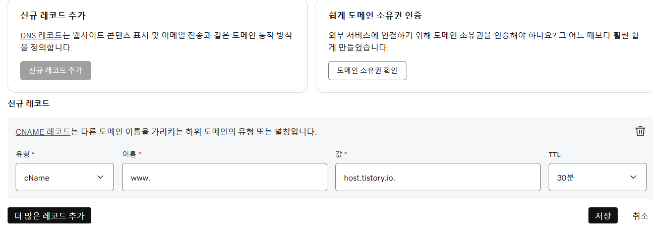 이렇게 하면 www.도메인.com 이 티스토리에 연결할 준비가 됐다.